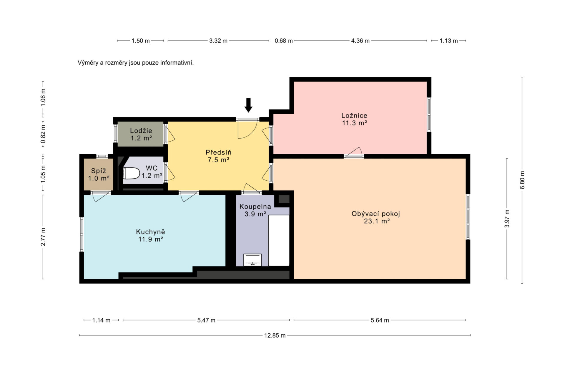 Dispozice bytu nabízí dva neprůchozí pokoje – obývací pokoj o výměře 23,1 m², ložnici 11,3 m², dále kuchyni o velikosti 11,9 m² s komorou (1 m²), koupelnu s vanou (3,9 m²), samostatnou toaletu (1,2 m²), předsíň (7,5 m²) a lodžii (1,2 m²). V 1. podzemním podlaží je k dispozici sklep o velikosti 3 m².