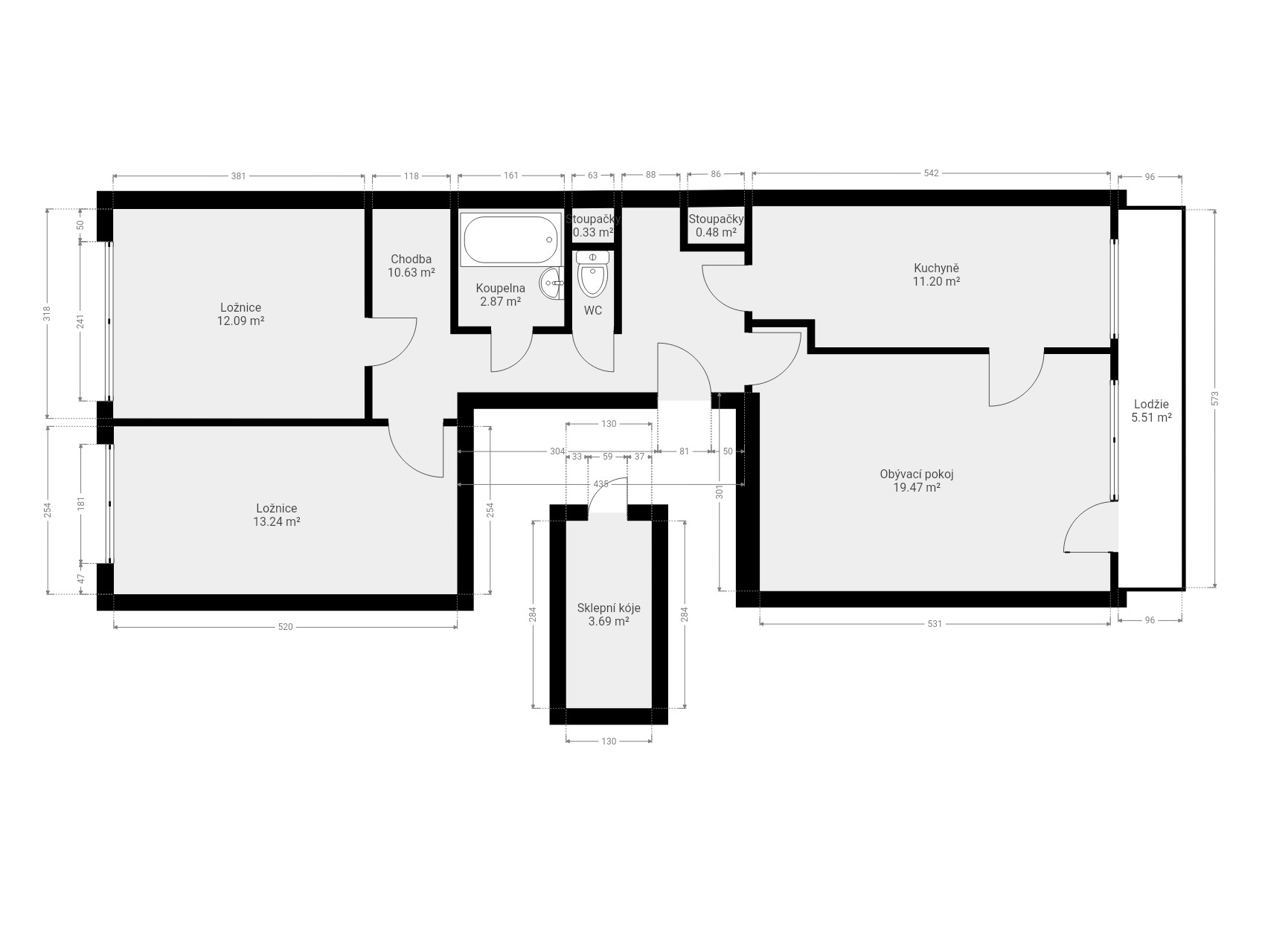 obývací pokoj 19,6 m2, ložnice 12,1 m2, dětský pokoj 13,2 m2, kuchyň 11,1 m2, koupelna 2,9 m2, WC 1,0 m2, předsíň 10,6 m2, sklep 3,6 m2 a lodžie 6,5 m2.
