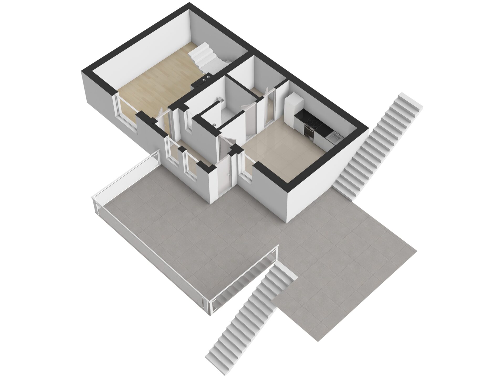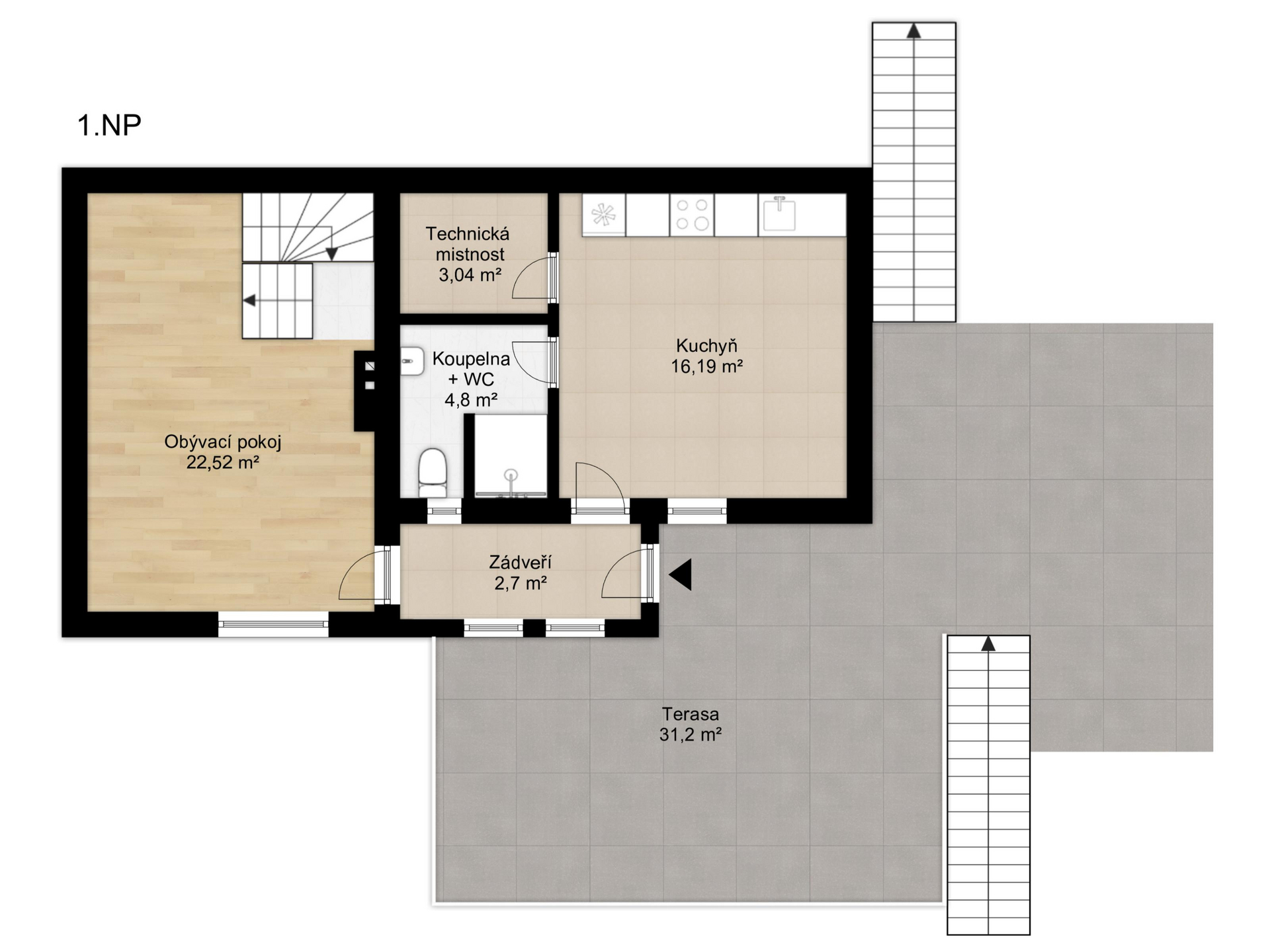 Dispozice domu nabízí v přízemí samostatnou kuchyni se základní výbavou spotřebičů, obývací pokoj, koupelnu se sprchovým koutem a toaletou, technickou místnost a zádveří.