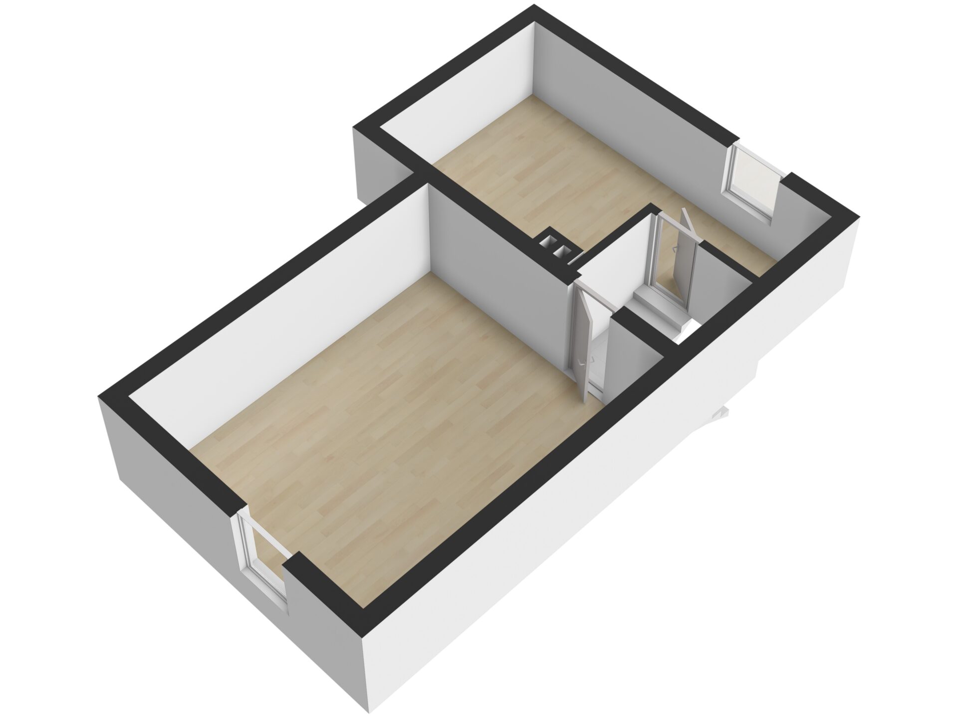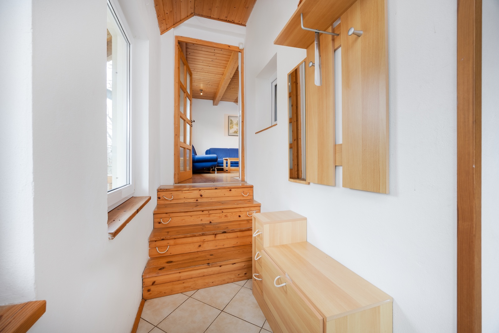 V podkroví se nachází hlavní ložnice a samostatný dětský pokoj. Jednotlivá podlaží jsou propojena schodištěm z ocelové konstrukce s dřevěnými stupni.