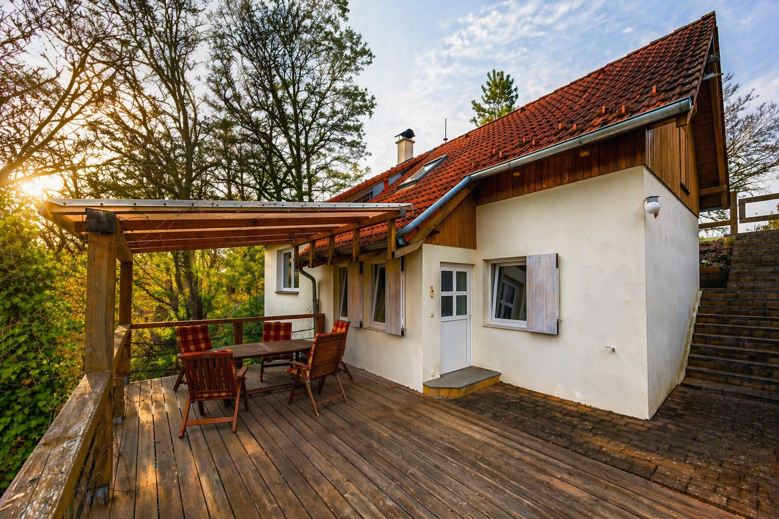 Venkovní část domu přirozeně navazuje na jeho charakter – k dispozici je prostorná bezúdržbová terasa ze sibiřskéhomodřínu s pergolou a příjemným posezením. Atmosféru letních dní umocní venkovní gril, nechybí ani dřevěný sklad pro uložení sezónních věcí a nářadí.