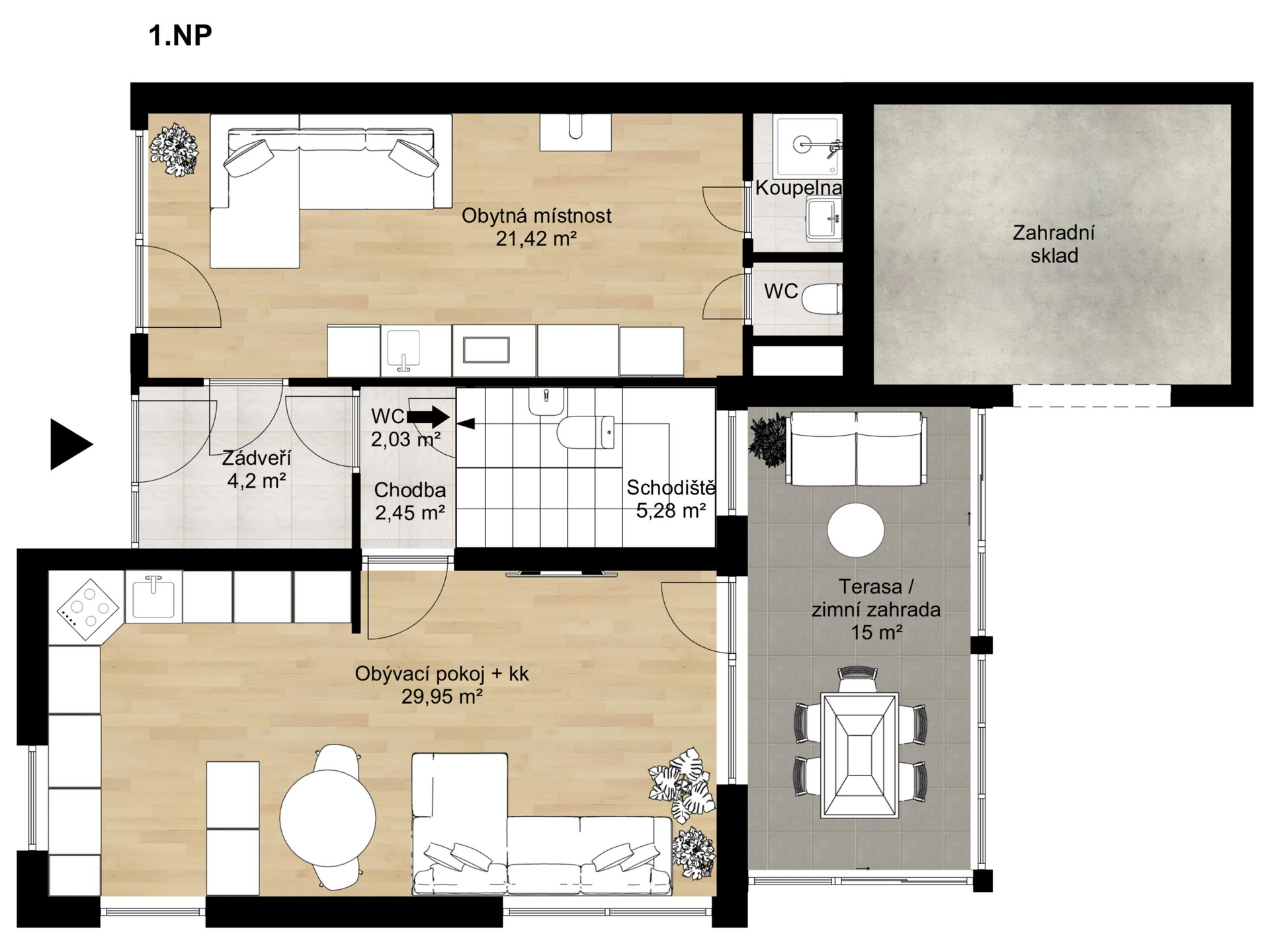 V 1. NP se nachází vstupní chodba, obývací pokoj s kuchyňským koutem a výstupem do zimní zahrady, samostatná toaleta a byt 1+kk s vlastním vstupem a koupelnou.