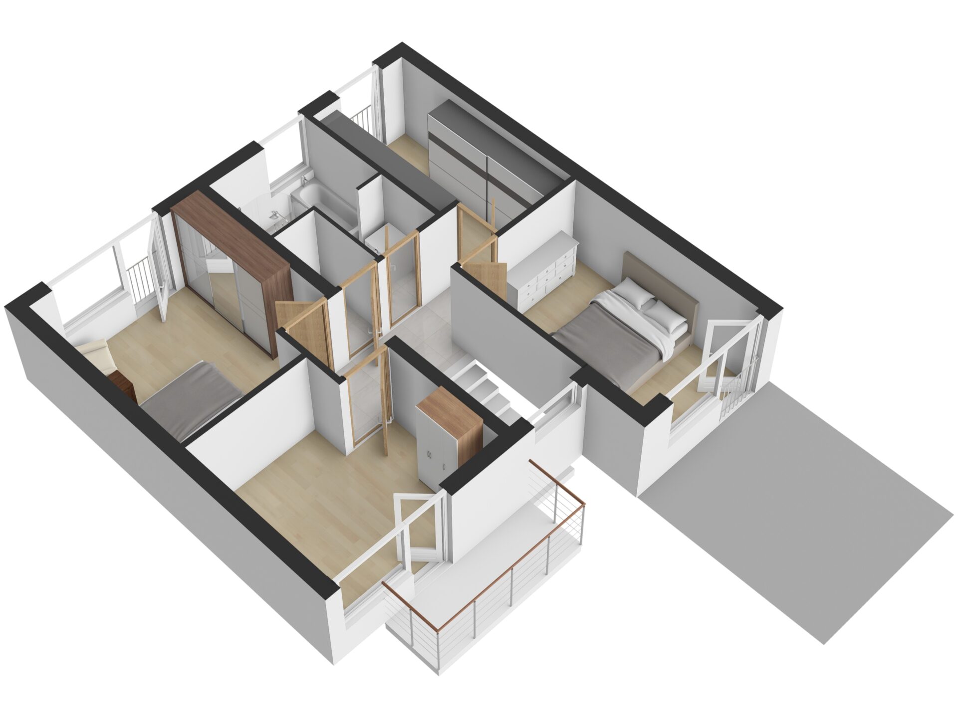 Z jedné ložnice je vstup na terasu, u druhé je možnost vybudování další terasy.