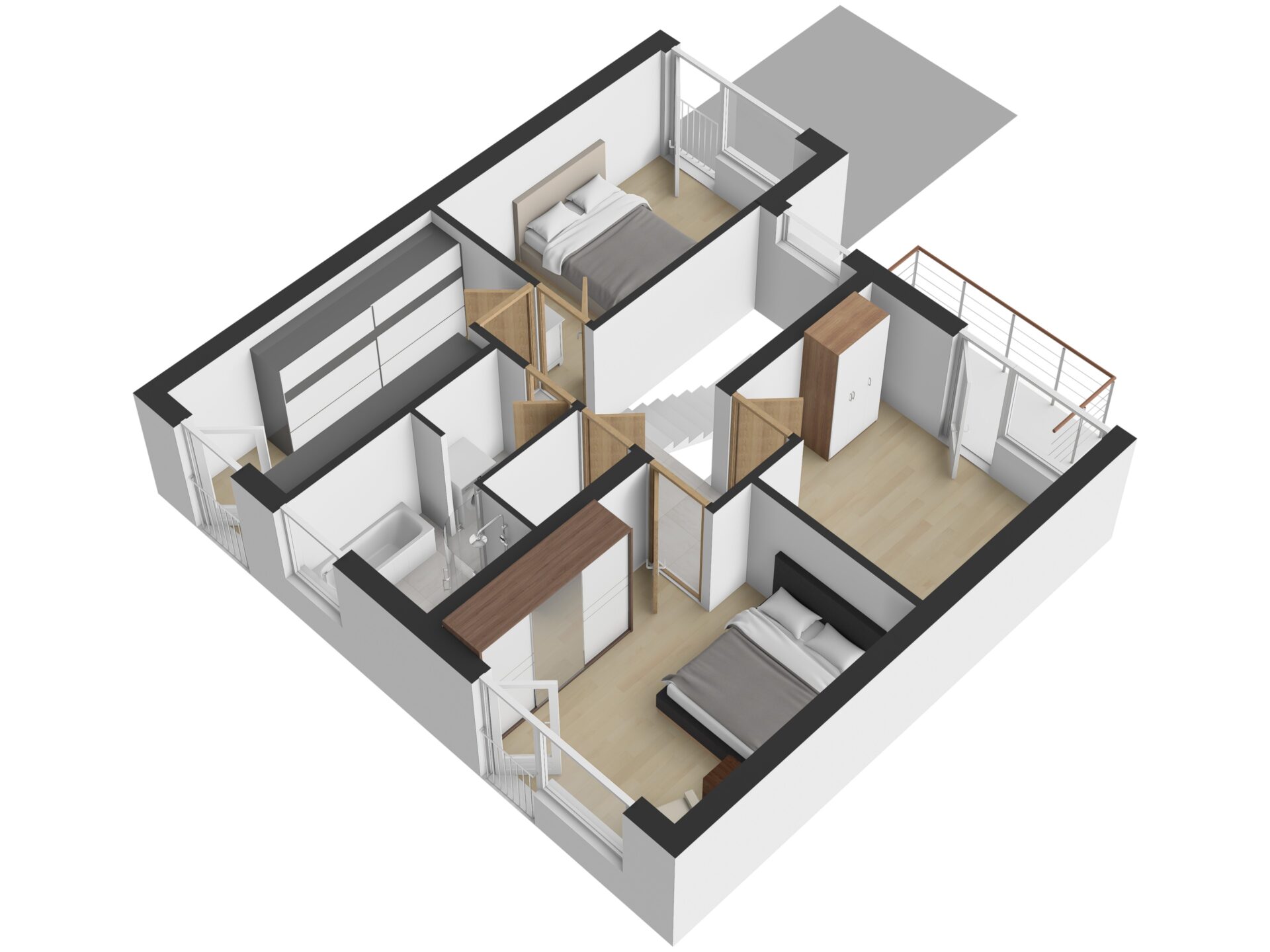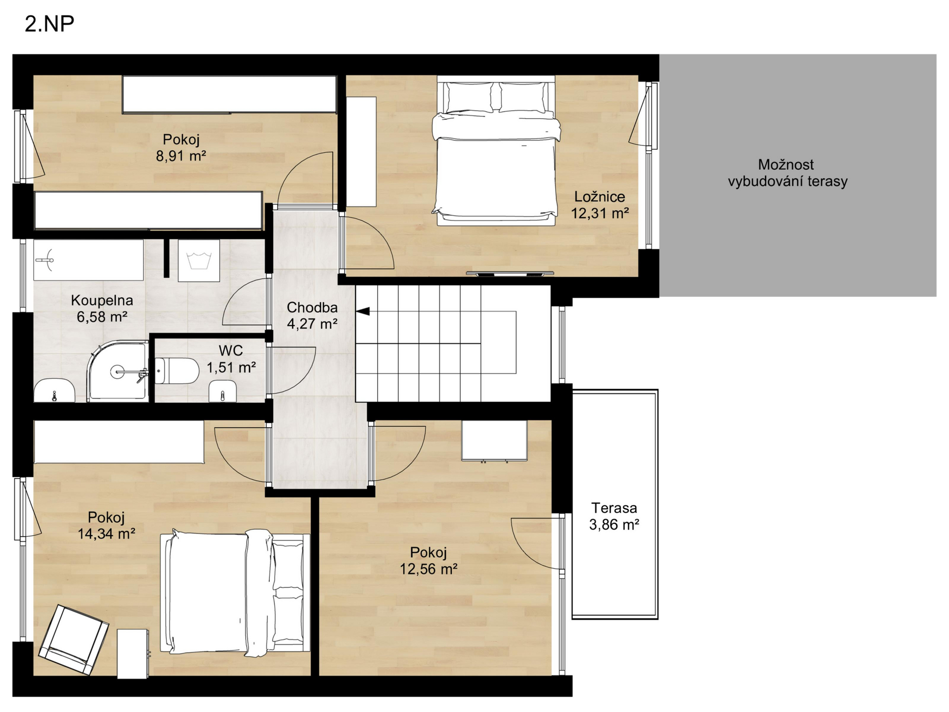 Ve 2. NP jsou tři ložnice, šatna (případně pracovna), koupelna s vanou, sprchovým koutem a samostatná toaleta.