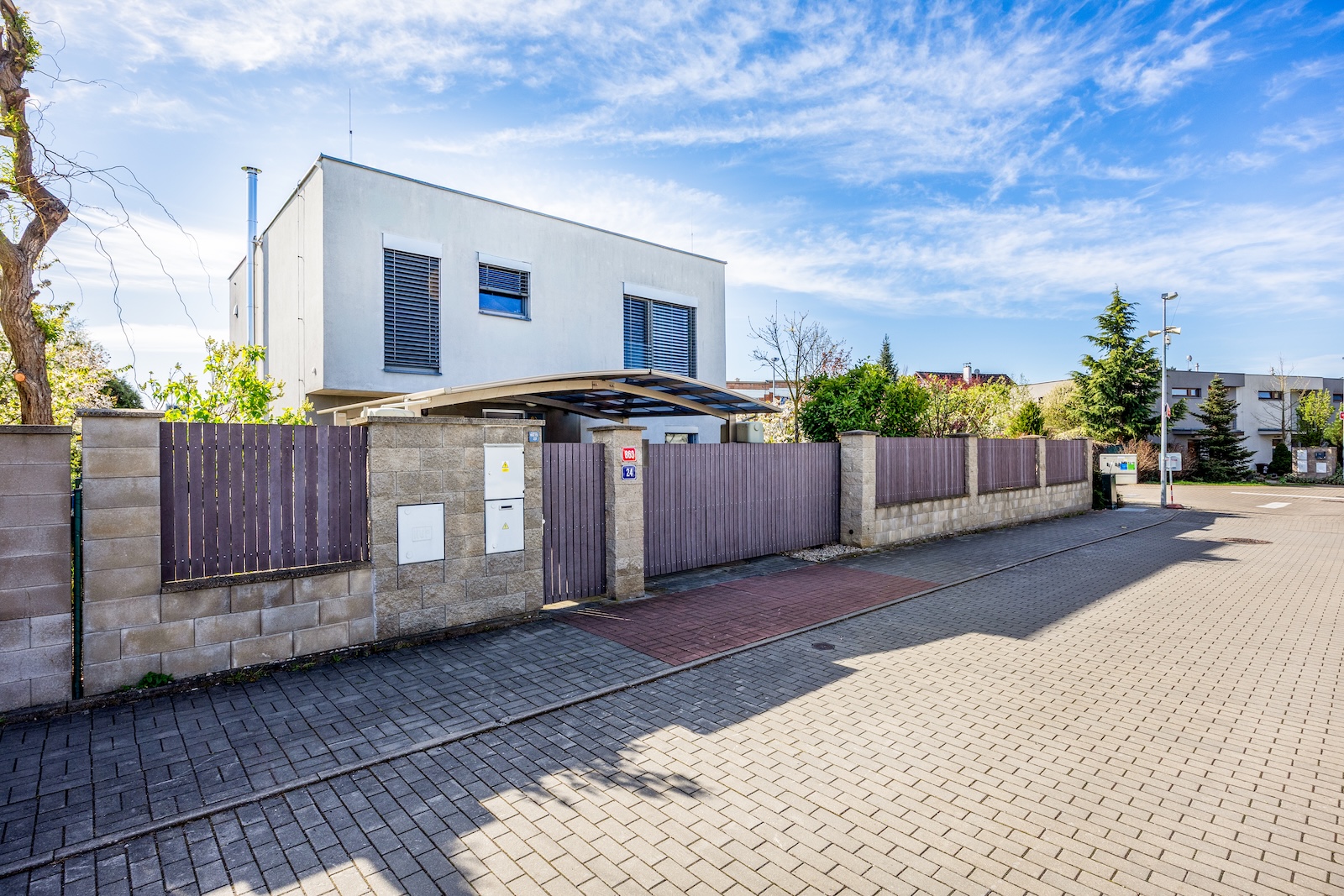 Komfort bydlení doplňuje vjezd na pozemek přes elektricky ovládaná vrata a elegantní kryté parkovací stání s vyhříváním.